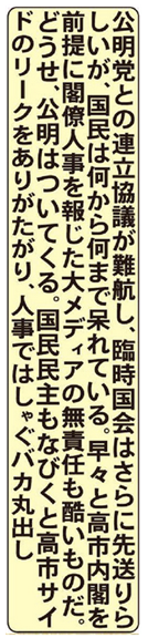 公明党との連立協議が難航し、臨時国会はさらに先送りらしいが、国民は何から何まで呆れている。早々と高市内閣を前提に閣僚人事を報じた大メディアの無責任も酷いものだ。どうせ、公明はついてくる。国民民主もなびくと高市サイドのリークをありがたがり、人事ではしゃぐバカ丸出し。