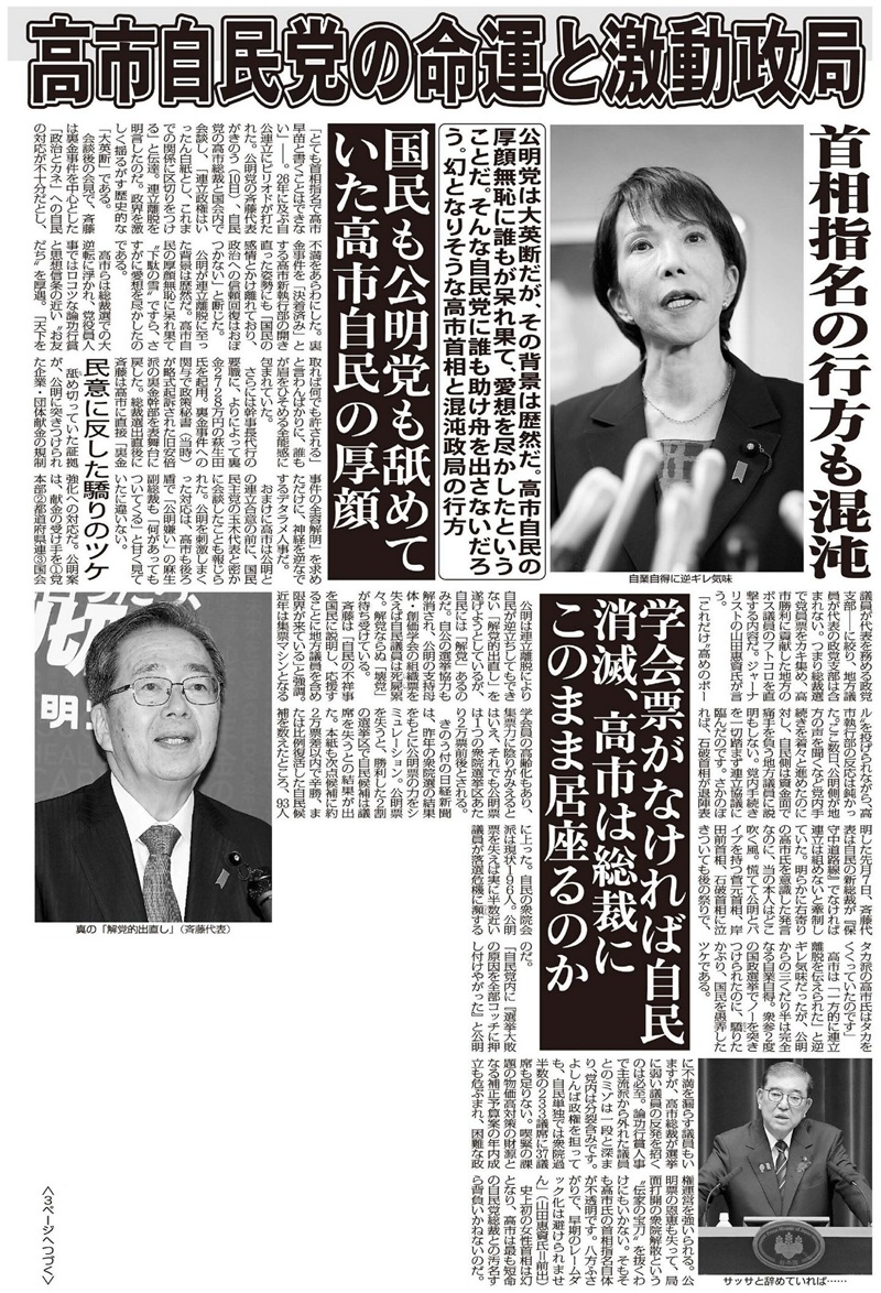 おまけに高市は公明との連立合意の前に、国民民主党の玉木代表と密かに会談したことも報じられた。公明を刺激しまくった対応は、高市も後ろ盾で「公明嫌い」の麻生副総裁も「何があってもついてくる」と甘く見ていたに違いない。