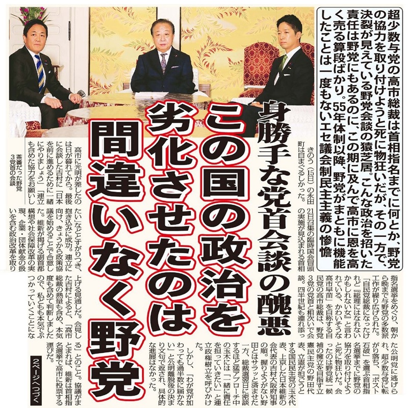 高市の動きに並行し、野党3党首の会談も開かれたが、とんだ猿芝居だった。