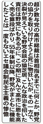 自民の参院選惨敗が引き金となった政治空白は、3カ月に及ぶ。国民置き去りの政治を招いた責任は野党にもあるのに、この期に及んで高市に高く恩を売る算段ばかり。身勝手な党首会談の醜悪さといったらない。同床異夢ですらなかったわけだ。この国の政治の劣化に間違いなく野党も手を貸している。