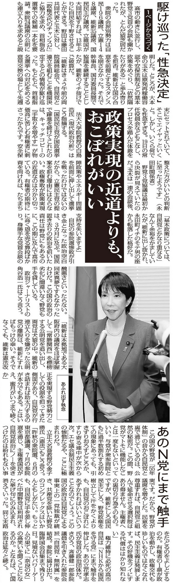 「昨秋の衆院選、6月の東京都議選、7月の参院選を通じ、主権者国民が自民党政治にノーを突きつけたのは紛れもない事実です。だから、野党が議席を増やした。民意を尊重すれば、自民党と組んで延命させる選択肢はあり得ません。主権者への裏切り行為そのもの。ですが、維新にしろ国民民主にしろ、野党政権を樹立して汗をかくよりも、自民党のおこぼれにあずかれればいいということなのでしょう。この国の政治は自民党による事実上の一党独裁が続き、共産党を除いた野党のコンプレックスはいかんともしがたい。もっとも、自民党に手を差し伸べた中間野党は利用された挙げ句にのみ込まれ、消えていった。同じ末路をたどるのをよしとするのか。有権者の1票が政治を動かし、政権交代も珍しいものではなくなれば、民主主義は発展します。その好機をフイにする代償ははかり知れない」