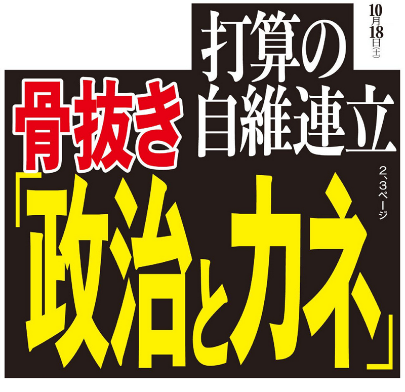 https://x.com/tomcat2013/status/1979012979191390299?utm_source=yjrealtime&utm_medium=search tama nekono @tomcat2013 打算だらけの自維連立…維新が突きつけた「企業・団体献金禁止」はやはりウヤムヤ? 怪しい本気度 https://nikkan-gendai.com/articles/view/news/379039 維新は12の柱からなる政策要求を自民に投げたが、経済政策、憲法改正などズラリ並んだ項目の中で「企業・団体献金の廃止」を含む政治改革はラストの12番目。 やる気なし!
