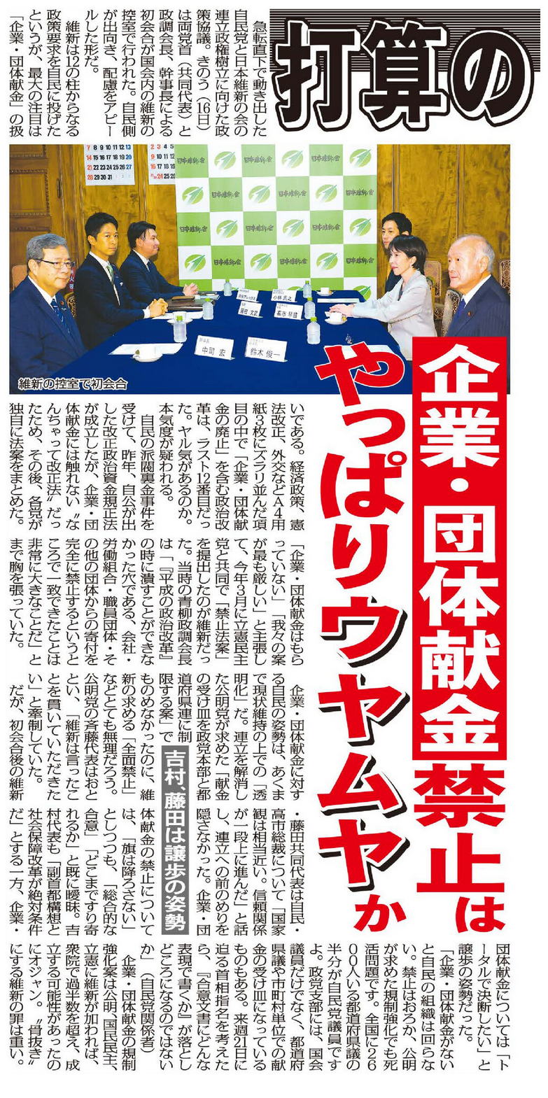 <▽45行くらい> 「企業献金禁止」を訴え続けていた維新、自民は反対。これで維新が折れて「裏金議員もOK」だったらもう国民から見放されるだろう。