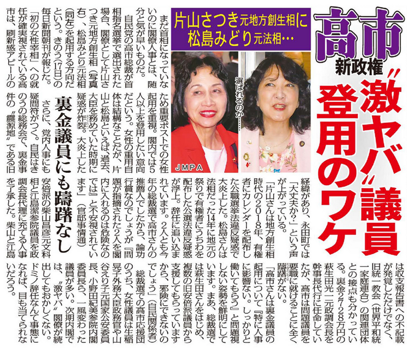 「片山さんは地方創生相時代の2018年、有権者にカレンダーを配布した公職選挙法違反疑惑で大炎上した。松島さんは法相だった14年に地元の祭りで有権者にうちわを配布した公選法違反疑惑が浮上。辞任に追い込まれています。2人とも今年の総裁選で高市さんの推薦人でしたから、論功行賞なのでしょうが『問題が指摘された2人を閣内に入れるのは危険なのでは』と不安視されています」(官邸事情通)