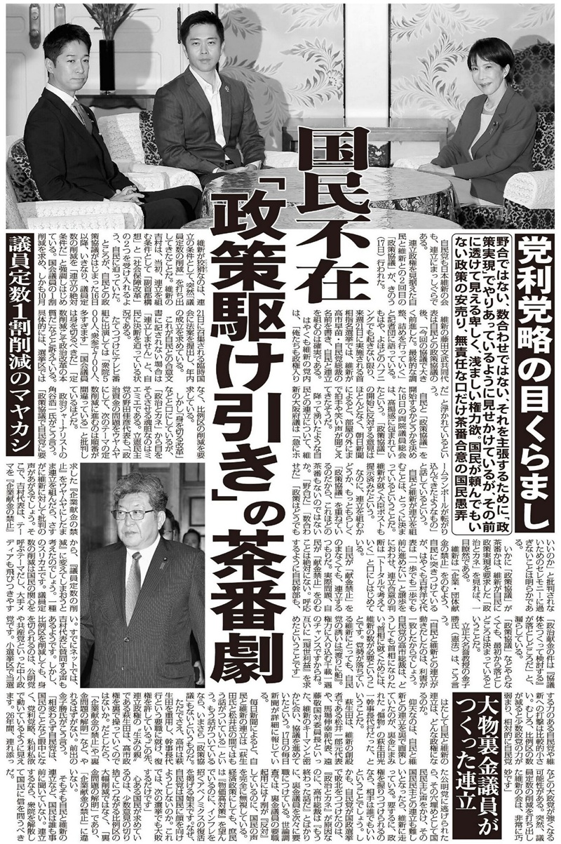 いかに「政策協議」が茶番かは、維新が自民に政策実現を要求した「政治とカネ」を見れば、一目瞭然である。