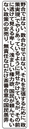野合ではない、数合わせではない、それを主張するために「政策実現」でやりあっているように見せかけているが、その前に透けて見える卑しく、浅ましい権力欲。国民が頼んでもいない政策の安売り、無責任な口だけ茶番合意の国民愚弄。