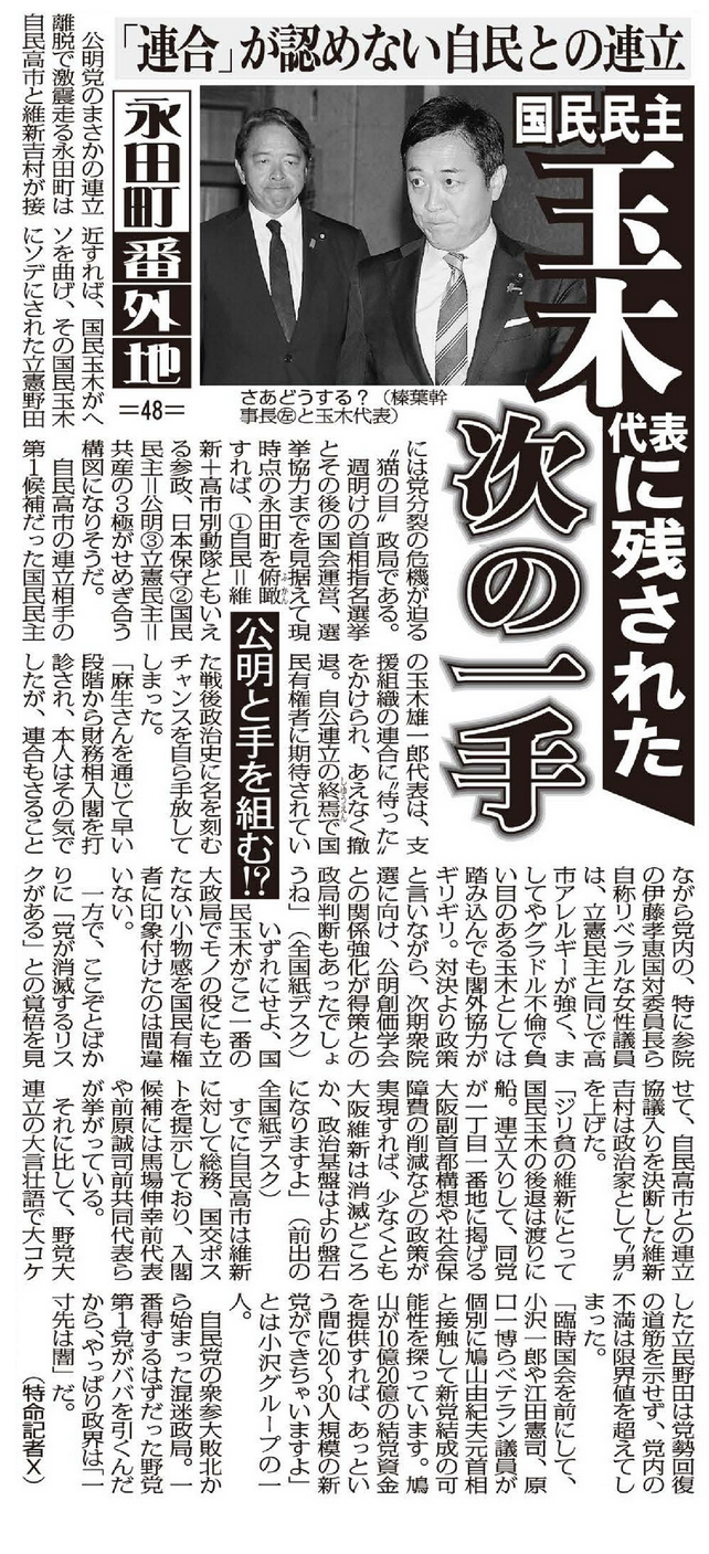 いずれにせよ、国民玉木がここ一番の大政局でモノの役にも立たない小物感を国民有権者に印象付けたのは間違いない。