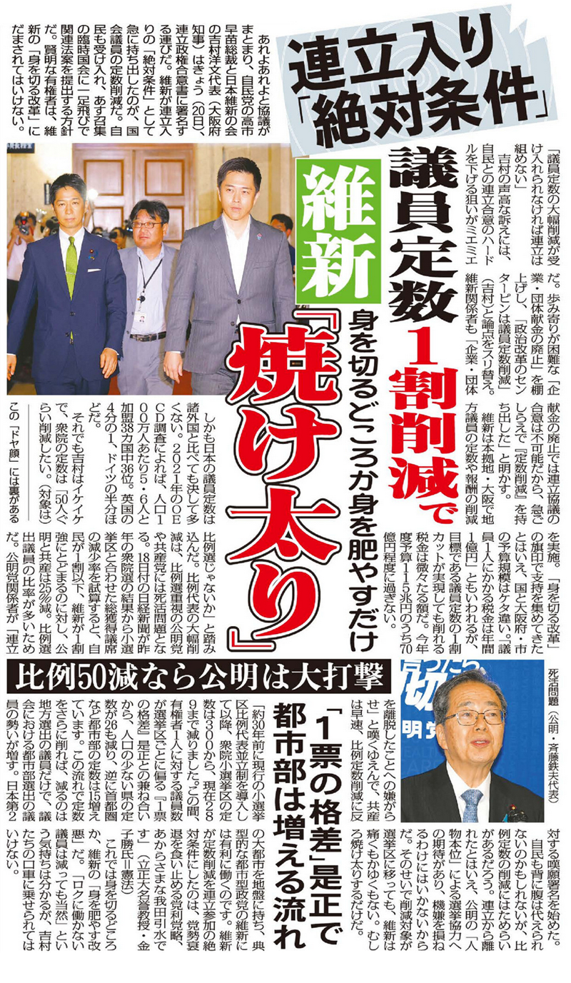 それでも吉村代表はイケイケで、衆院の定数は「50人ぐらい削減したい。(対象は)比例選じゃないか」と踏み込んだ。比例代表の大幅削減は、比例選重視の公明党や共産党には死活問題となる。18日付の日経新聞が昨年の衆院選の結果から小選挙区と合わせた総獲得議席の減少率を試算すると、自民が1割以下、維新が1割強にとどまるのに対し、公明と共産は25%減。比例選出議員の比率が多いためだ。公明党関係者が「連立を離脱したことへの嫌がらせ」と嘆くゆえんで、共産は早速、比例定数削減に反対する嘆願署名を始めた。