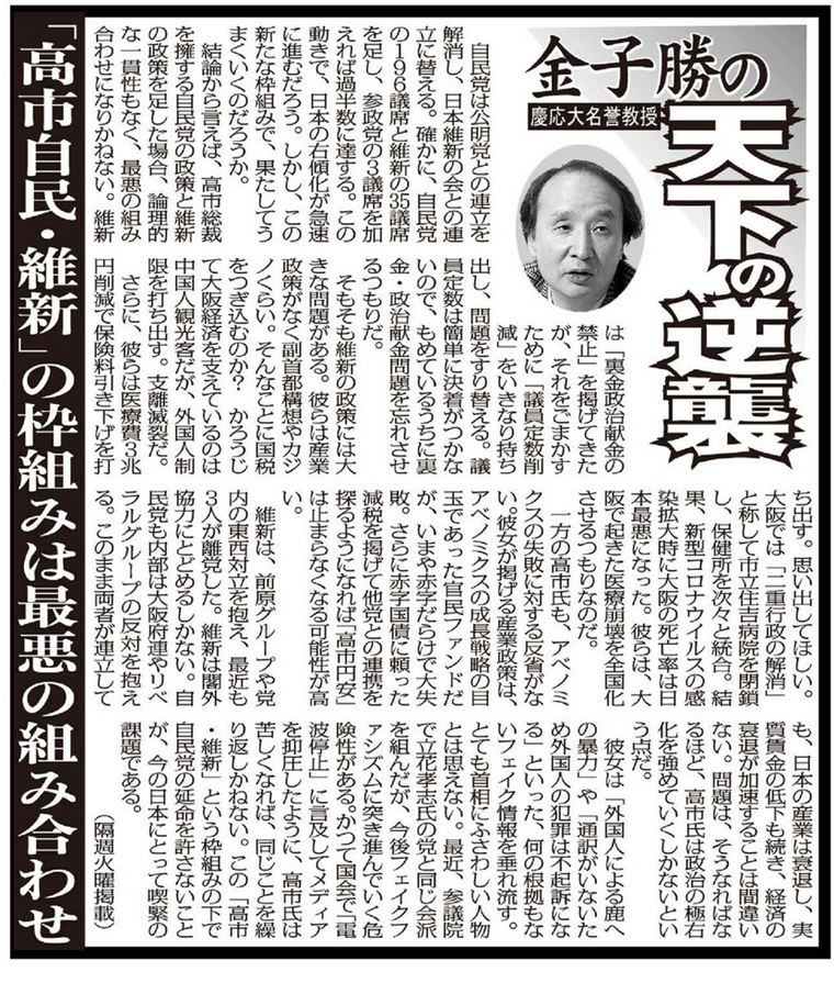 👉武富士が「指定暴力団山口組関係者の助力を得た」と認定する民事訴訟の判決 ___ ➡➡暴力団・東声会(東亜会)のトップ・町井久之(本名:鄭建永)の自宅のおかれた東亜マンションを、朝堂院大覚が管理している 同和のドン≒朝堂院大覚⇒⇒★部落:崇仁協議会すうじん ➡➡暴力団・東声会(東亜会)のトップ・町井久之(本名:鄭建永) ___ 暴力団の首領:笹川良一(日本船舶振興会初代会長)の三男陽平 ➡➡👉武富士によって買収された崇仁地区の土地は笹川陽平傘下の朝鮮総連系の会社に売却されました。 ___ 同和暴力団政党:維新、吉村洋文 盗聴使用の武富士弁護士 ・・・👉👉トクチョン徳川橋下徹:在日朝鮮人「劉昇一郎」選挙対策本部長 Google 画像検索 橋下徹氏「沖縄に中国の拠点を作る。本気で取り組む ➡➡👉橋下徹:上海電力 問題。中国側へ利権誘導 武富士は、同和団体:崇仁協議会と契約して京都市で地上げをすすめた八〇年代から、右翼・暴力団との関係が指摘されています。 ことし六月には、★★ ⇒武富士が「指定暴力団山口組関係者の助力を得た」と認定する民事訴訟の判決が東京高裁で出されました。 ___ 京都駅の被差別部落・崇仁地区と松浦グループは深い繋がりがありました。 京都市の最大の被差別部落と言われているのがJR京都駅の東側にある崇仁地区です。 崇仁地区は全国でも最大規模の被差別部落と言われています。 崇仁地区、東九条には明治から戦後にかけてコリアンの人たちが8万人以上住んでいました。 戦後、それらのコリアンの人たちは朝鮮に帰ることなく崇仁地区、東九条に住み続けました。 崇仁地区を統括している崇仁協議会と松浦グループは深い関係がありました。 全国の被差別部落、同和のドンと呼ばれているのが朝堂院です。 崇仁地区の3300坪の土地を所有していたのは朝鮮総連系の企業でした。 ***** 武富士を崩壊に導いたのが京都の同和地区の崇仁地区の用地買収でした。 1985年、武富士会長の武井保雄のところに京都の七条の崇仁地区の開発案件が持ち込まれました。 武富士の武井保雄は顧問の芙蓉の谷口美雅(笹川陽平の配下)を通じて朝堂院、笹川陽平に後ろ盾となってもらい崇仁協議会を設立しました。 崇仁協議会の初代会長には地元の暴力団の内浜会の元組長で全日本同和会洛南副支部長の藤井鉄雄が就任しました。 幹部には全日本同和会洛南支部長の高谷泰三が就きました。 石高嘉昭は事務局長に就きました。武富士の顧問の芙蓉の谷口美雅(笹川陽平の配下) 武富士によって買収された崇仁地区の土地は笹川陽平傘下の朝鮮総連系の会社に売却されました。 崇仁地区は会津小鉄会の組員らも多く住んでいて ***** ➡➡👉『日本国侵略を企てする、同和暴力団政党:維新橋下徹』 ★ 国家反逆罪 :中共の手先、反日同和暴力団政党:維新、橋下徹 の沖縄中国拠点化・売国の本性 ★ ・・・元選挙統括本部長:在日朝鮮人『劉』、覚醒剤で現行犯逮捕 元大阪府知事の橋下徹は 自著「沖縄問題解決策はこれだ!」に、↓のように書いています。 沖縄はいまは、普天間基地の辺野古移設に様々な抵抗をしかけていますが、防戦一方です。 防戦だけでは事態は開けません。やはり攻撃に反転しなければならない。 ___ 極左過激派:反日維新、橋下徹 沖縄の中国拠点化を画策 国家反逆罪 :反日維新、橋下徹 ⇒ 『日本にさよならを言い渡す』 「沖縄の独立」「沖縄の港を中国に貸すこと」を問う住民投票は、沖縄の反転攻勢のきっかけになるでしょう。 ・・・・・・『日本にさよならを言い渡す』。・・・・・・・・・ そして 『 日本が一番嫌がること、』 すなわち、★ 沖縄に中国の拠点を作ることに本気で取り組むぞ」 ★ という覚悟と気迫を持って、 ★ 国家転覆を企てる、帰化在日政党、中共産の手先、反日維新:橋下徹 ★ 大阪府知事だった当時の橋下徹と、「いかに国を転覆するか密談した」 と思わず口をすべらした。 当時の民主党の総務大臣:原口一博が「地方分権」という言葉を ***** 明確な日本国に対する侵略勢力:【・・日本侵略の李氏朝鮮政策を推し進める: トクチョン河野太郎:韓国LINEスマートシティ構想を推進➡➡👉朝鮮ソフトバンク孫正義ソンジョンウィ『李玉子・李元照』 トクチョン松平容保岸田文雄容疑者(首相・妻は「李」裕子)(福田康夫に似る):『李嘉誠』は『福田康夫』 ・・・日本国を侵略:竹島不法侵略、李承晩ライン:『李承晩』は暴力団『福田赳夫』 岸田文雄は暴力団の首領笹川良一(北朝鮮統一教会)の親戚 +++トクチョン徳川斉昭河野洋平太郎容疑者(デジタル担当):「墓は朝鮮式」トクチョン徳川慶喜の父・・】 完全に日本国に対する侵略者であるトクチョン河野太郎:中国系企業から100%電力供給の自衛隊基地が。推進した河野太郎氏に寄せられる憤激 暴力団勢揃いの港湾顧問のトクチョン河野家! 河野太郎の元秘書は、生粋の韓国人。名前は李成権パククネ_ハンナラ党代表の側近 ___ 朝鮮ソフトバンク:孫正義ソンジョンウィと、「墓は朝鮮式:伊藤博文」の養