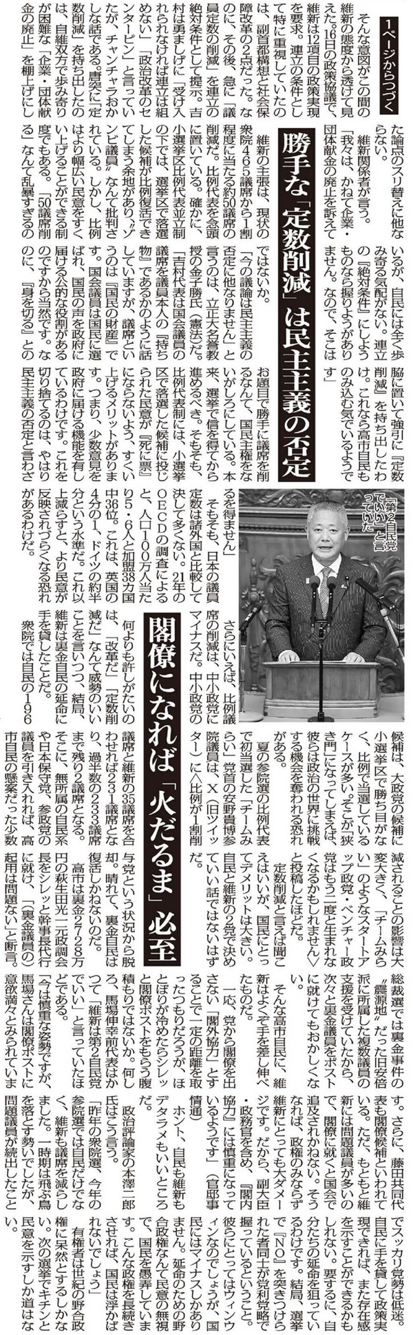 「吉村代表は国会議員の議席を議員本人の『持ち物』であるかのように話していますが、議席というのは『国民の財産』です。国会議員は国民に選ばれ、国民の声を政府に届ける公的な役割があるのですから当然です。なのに、『身を切る』とのお題目で勝手に議席を削るなんて、国民主権をないがしろにしている。本来、選挙で信を得てから進めるべき。そもそも、比例代表制には、小選挙区で落選した候補に投じられた民意が『死に票』にならないよう、すくい上げるメリットがあります。つまり、少数意見を政府に届ける機能を有しているわけです。これを切り捨てるのは、やはり民主主義の否定と言わざるを得ません」
