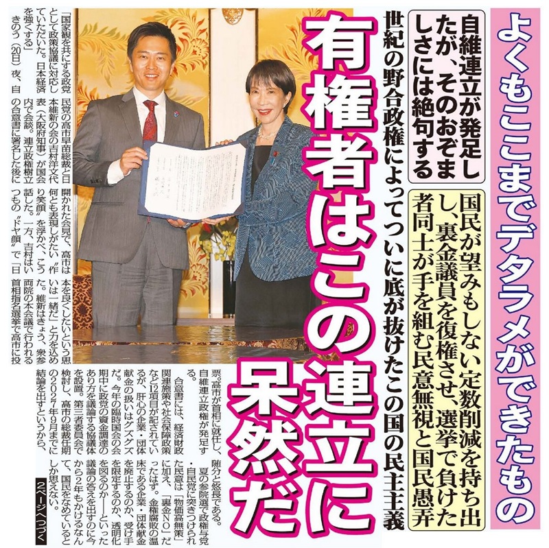 自維連立が発足したが、そのおぞましさには絶句する。国民が望みもしない定数削減を持ち出し、裏金議員を復権させ、選挙で負けた者同士が手を組む民意無視と国民愚弄。世紀の野合政権によってついに底が抜けたこの国の民主主義。