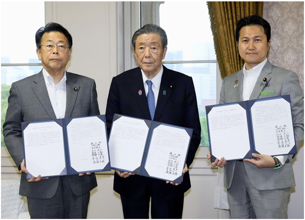 ただただ削減と切り捨て(自公維3党が社会保障改革に合意、左から公明党の西田幹事長、自民党の森山幹事長、日本維新の会の岩谷幹事長)/(C)共同通信社