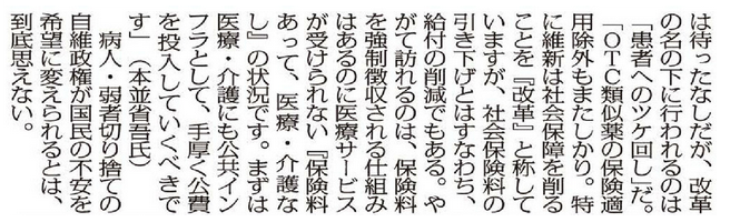 しかし、である。問題は、通常国会で自民・公明・維新が交わした社会保障改革と骨太方針に関する3党合意の実現がうたわれていること。一般病床・療養病床・精神病床の11万床削減やOTC類似薬の保険適用除外が目玉だ。全国の医師・歯科医師約10万7000人で構成される全国保険医団体連合会事務局次長の本並省吾氏が言う。