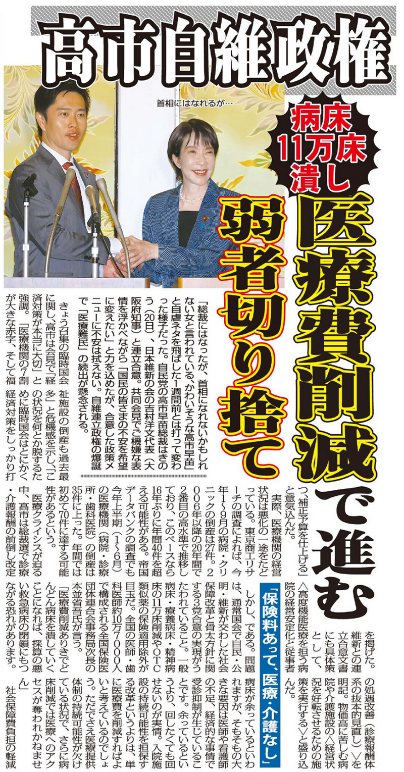 「総裁にはなったが、首相になれないかもしれない女と言われている、かわいそうな高市早苗」と自虐ネタを飛ばした1週間前とは打って変わった様子だった。自民党の高市早苗総裁は20日、日本維新の会の吉村洋文代表(大阪府知事)と連立合意。共同会見でご機嫌な表情を浮かべながら「国民の皆さまの不安を希望に変えたい」と力を込めたが、合意した政策メニューに不安は拭えない。自維連立政権の爆誕で「医療難民」の続出が懸念される。