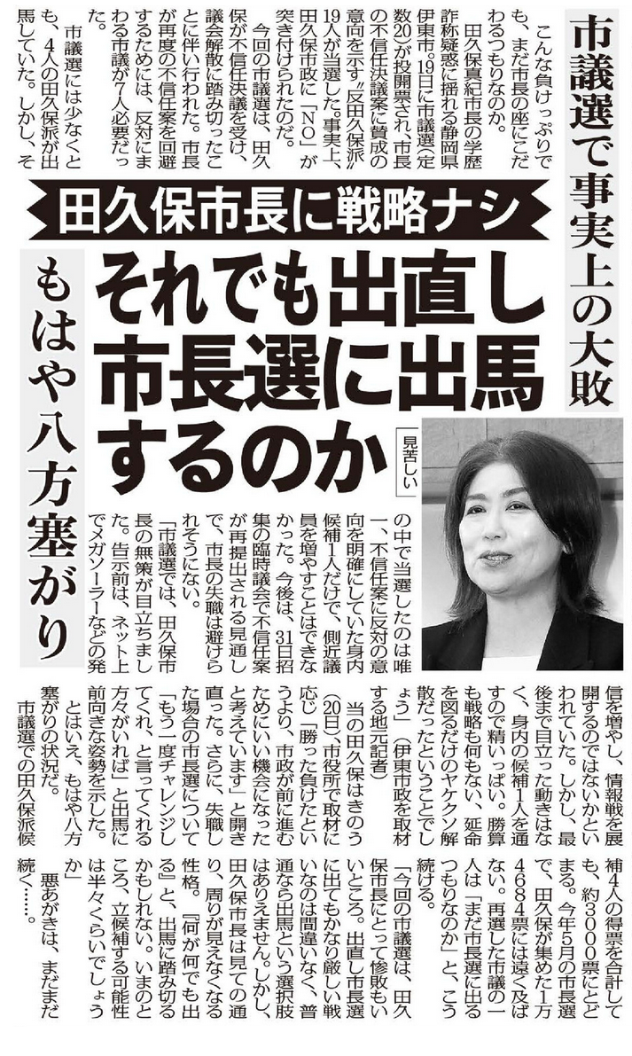 田久保真紀・伊東市長をめぐる騒動は【もっと読む】【さらに読む】で詳しく報じている。