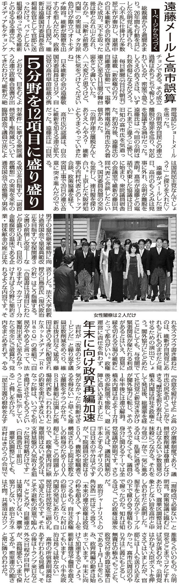 毎日新聞(22日付朝刊)は連載「新政権の行方 自維連立始動」で、電撃連立に至る11日間の舞台裏をこう書いていた。
