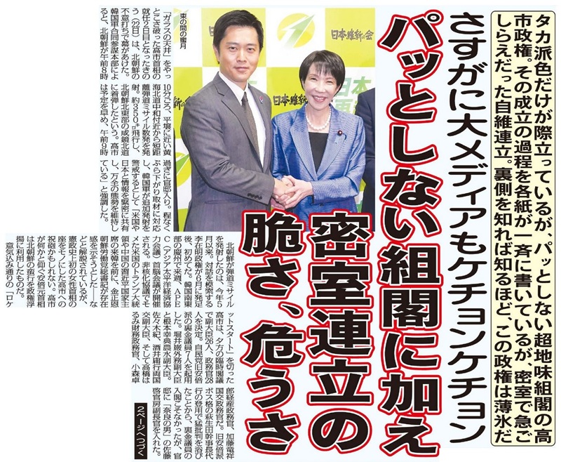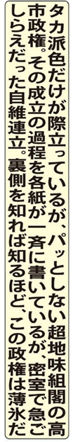 選挙区調整にしても、吉村はきのうの会見で「現時点で必要ない」と明言。政策協議に臨むにあたり、選挙区調整は対象としない旨を高市と申し合わせたと説明した。握手をしながらテーブルの下で蹴り合う腹積もりで握ったのか。知れば知るほど、この政権は薄氷だ。