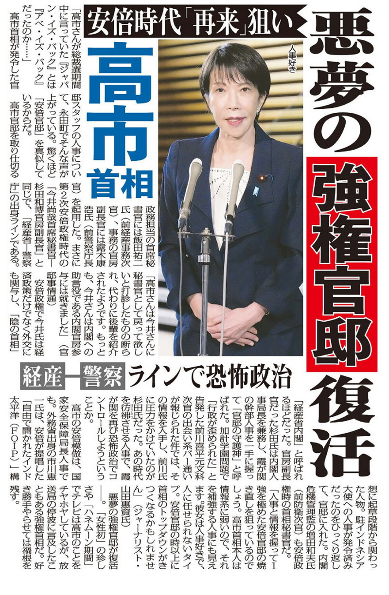 「人事と情報を握って1強を極めた安倍官邸の焼き直しを狙っているのでしょう。高市首相本人は情報系に弱いので、それを補強する人事にも見えます。彼女は人事好きで、人に任せられないタイプ。安倍官邸の時以上に首相のトップダウンがきつくなるかもしれません」(ジャーナリスト・山田惠資氏)