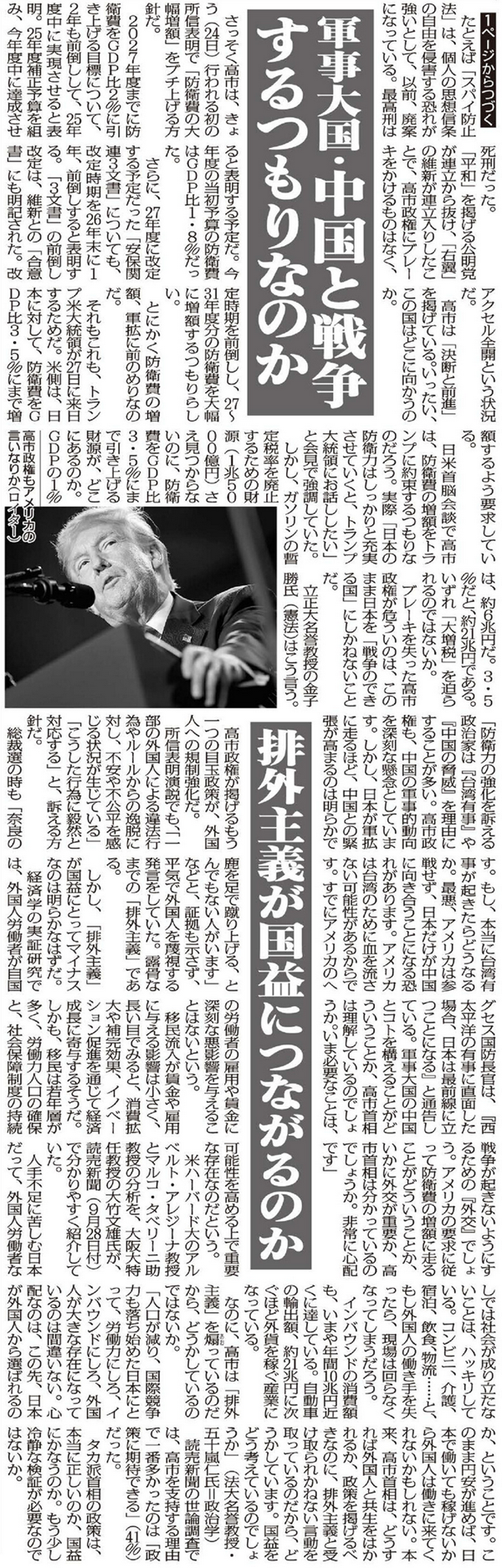 日米首脳会談で高市は、防衛費の増額をトランプに約束するつもりなのだろう。実際「日本の防衛力はしっかりと充実させていくと、トランプ大統領にお話ししたい」と会見で強調していた。