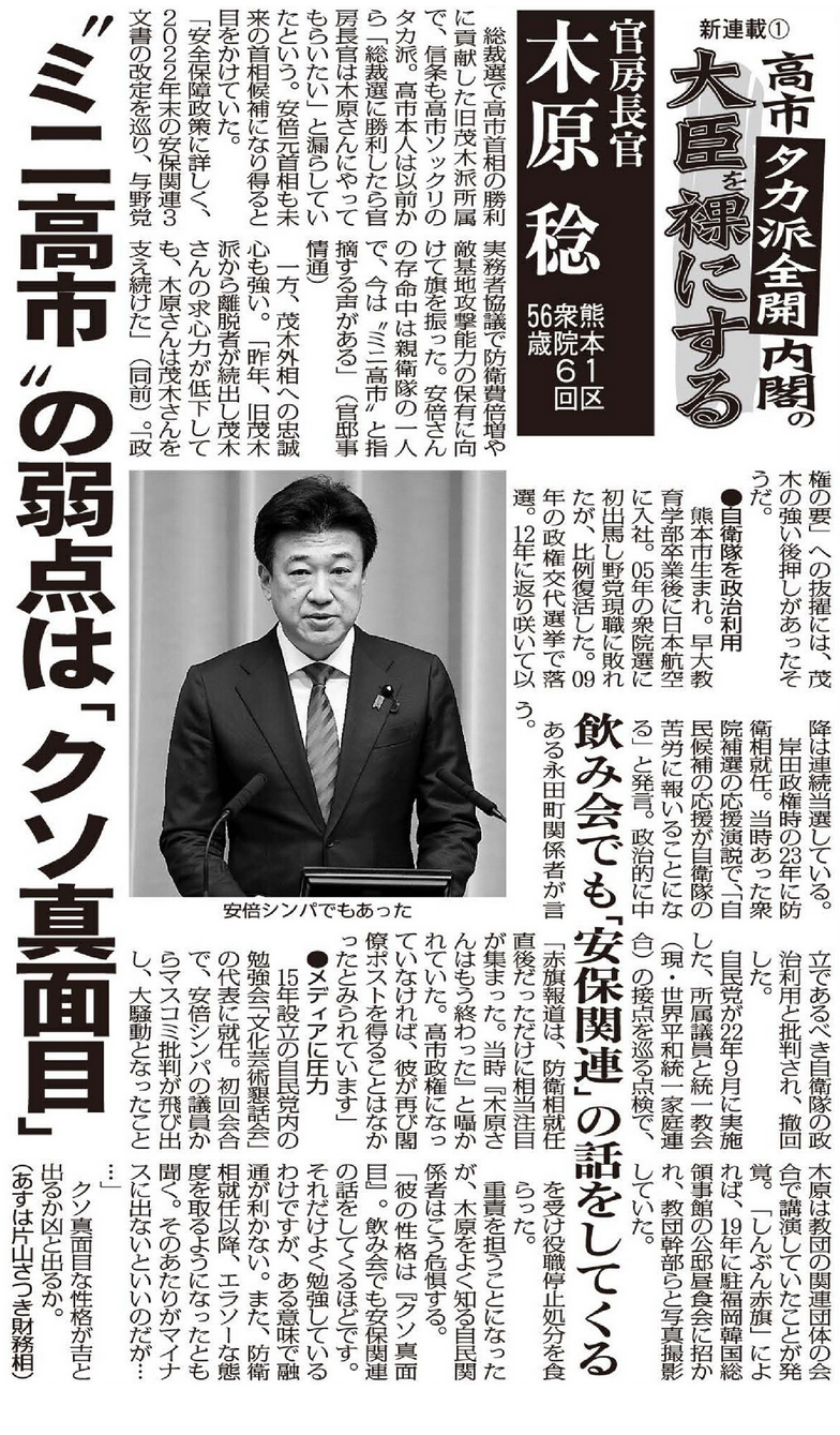 「赤旗報道は、防衛相就任直後だっただけに相当注目が集まった。当時『木原さんはもう終わった』と囁かれていた。高市政権になっていなければ、彼が再び閣僚ポストを得ることはなかったとみられています」