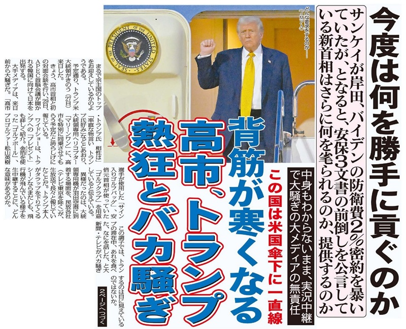 大手メディアは、来日前から大騒ぎだ。「高市・トランプ氏 相性は」「率直な物言い トランプ氏好み」などとあおり、大統領専用ヘリコプター「マリーンワン」に、高市も特別に同乗させてもらう予定だと誇らしげに報じている。