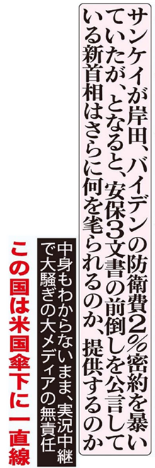 サンケイが岸田、バイデンの防衛費2%密約を暴いていたが、となると、安保3文書の前倒しを公言している新首相はさらに何を毟られるのか、提供するのか。 中身もわからないまま、実況中継で大騒ぎの大メディアの無責任。