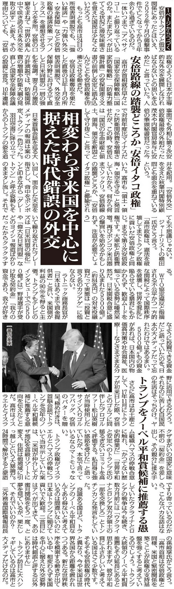 WTO協定違反と指摘される不公平かつ一方的な関税によって国際秩序を破壊し、世界を混乱に陥らせている暴君にもかかわらず、歓迎ムードを煽っている姿勢に唖然呆然だ。日米関税合意に盛り込まれた5500億ドル(約84兆円)の対米投融資だって実態は「投資と言う名のカツアゲ」に他ならない。