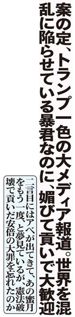 案の定、トランプ一色の大メディア報道。世界を混乱に陥らせている暴君なのに、媚びて貢いで大歓迎。二言目にはアベが出てきて、あの蜜月をもう一度、と夢見ているが、憲法破壊で貢いだ安倍大罪を忘れたのか。