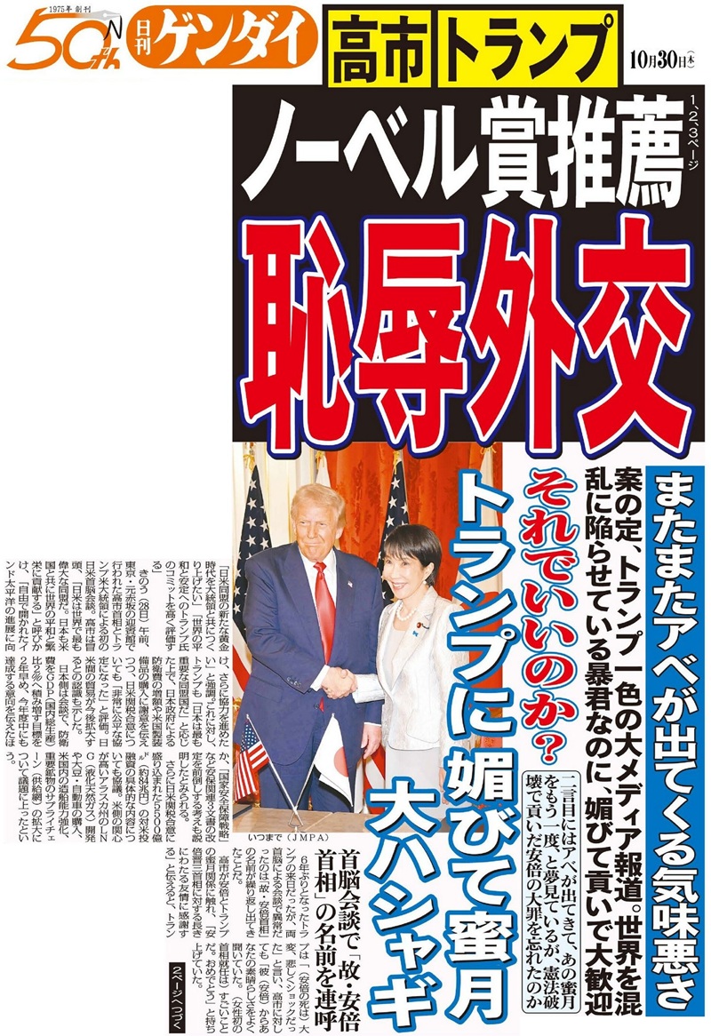 さらに高市はお土産として、17年11月にトランプが初来日した際、安倍とのゴルフに同伴したプロゴルファー松山英樹が当時使用したサイン入りゴルフバッグ、安倍のパターを贈呈。極め付きは、首脳会談でトランプを26年のノーベル平和賞候補に推薦する意向を伝えたことだ。高市はイスラエルとイスラム組織ハマスの停戦合意に触れ、「かつてない歴史的偉業だ」「世界平和と安定へのトランプ氏の揺るぎないコミットを高く評価する。私自身も強い感銘を受けた」と語っていたが、本気で言っているならマトモじゃない。