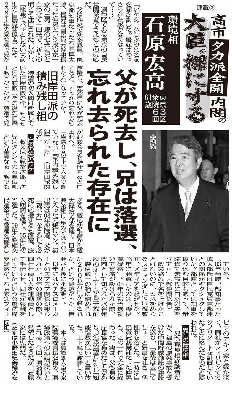 「03年当時、都知事だった慎太郎氏は自民党東京都連との関係がギクシャクしていた。都連としては知事を取り込む目的もあって、衆院選で宏高氏に白羽の矢を立てた」(都連関係者)