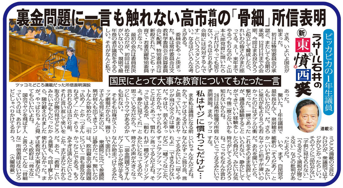 裏金問題に一言も触れない高市首相の「骨細」所信表明…国民に大事な教育についてもたった一言 ラサール石井 新・東憤西笑