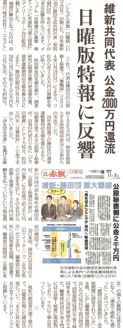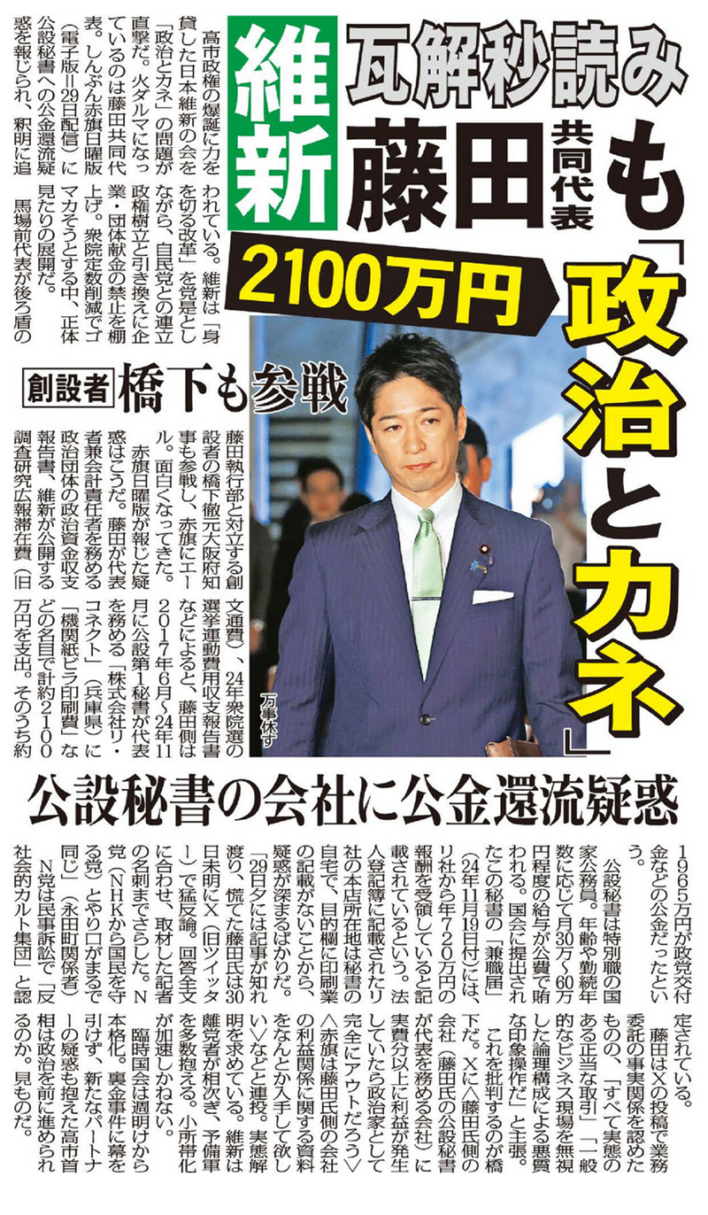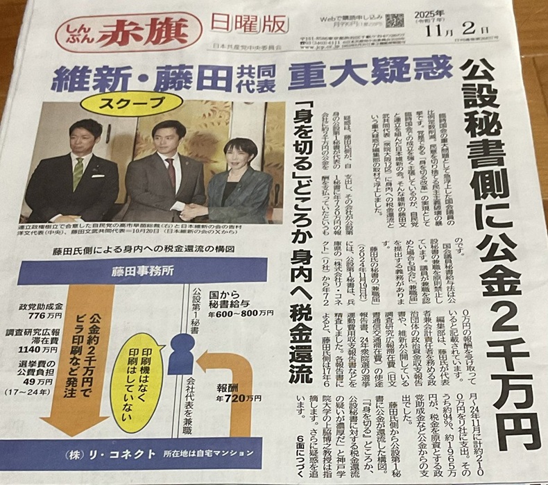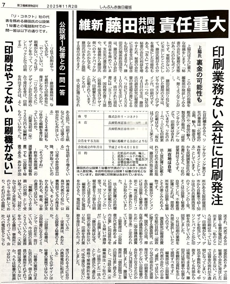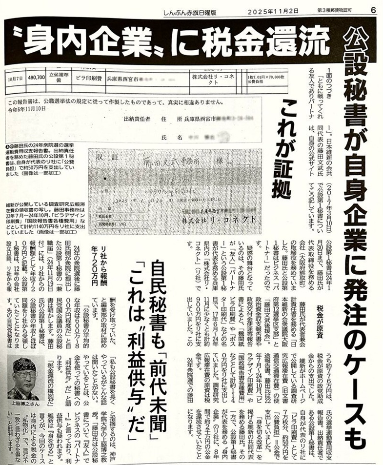 赤旗日曜版が報じた疑惑はこうだ。藤田氏が代表者兼会計責任者を務める政治団体の政治資金収支報告書、維新が公開する調査研究広報滞在費(旧文通費)、24年衆院選の選挙運動費用収支報告書などによると、藤田氏側は2017年6月〜24年11月に公設第1秘書が代表を務める「株式会社リ・コネクト」(兵庫県)に「機関紙ビラ印刷費」などの名目で計約2100万円を支出。そのうち約1965万円が政党交付金などの公金だったという。