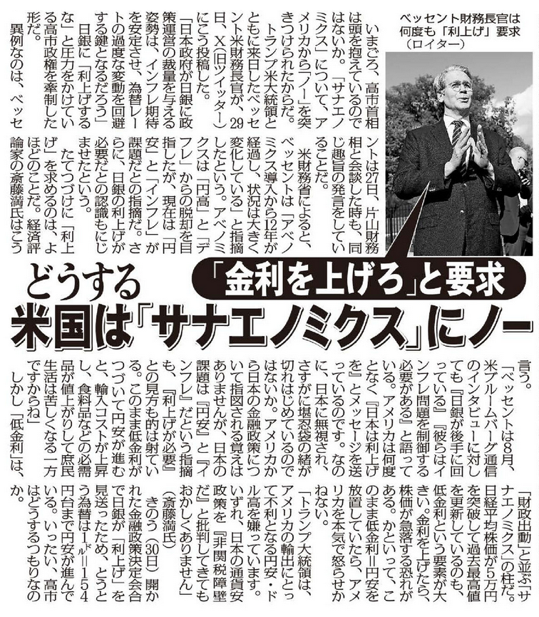 「ベッセントは8月、米ブルームバーグ通信のインタビューに対しても『日銀が後手に回っている』『彼らはインフレ問題を制御する必要がある』と語っている。アメリカは何度となく『日本は利上げを』とメッセージを送っているのです。なのに、日本に無視され、さすがに堪忍袋の緒が切れはじめているのではないか。アメリカから日本の金融政策について指図される覚えはありませんが、日本の課題は『円安』と『インフレ』だという指摘も、『利上げが必要』との見方も的は射ている。このまま低金利がつづいて円安が進むと、輸入コストが上昇し、食料品などの必需品が値上がりして庶民生活は苦しくなる一方ですからね」