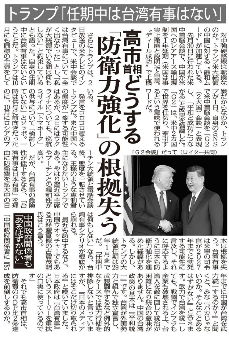だが、台湾有事の危険性が低下するなら、「台湾有事は日本有事」を理由に防衛費を拡大中の日本は根拠を失う。台湾有事は米軍の司令官が2027年までに勃発する可能性に言及し、それに呼応するように日本も防衛力強化を進めた経緯がある。しかし、トランプ大統領の任期は29年1月までだ。「任期中は何もしない」なら、台湾有事シナリオが根底から崩れる。