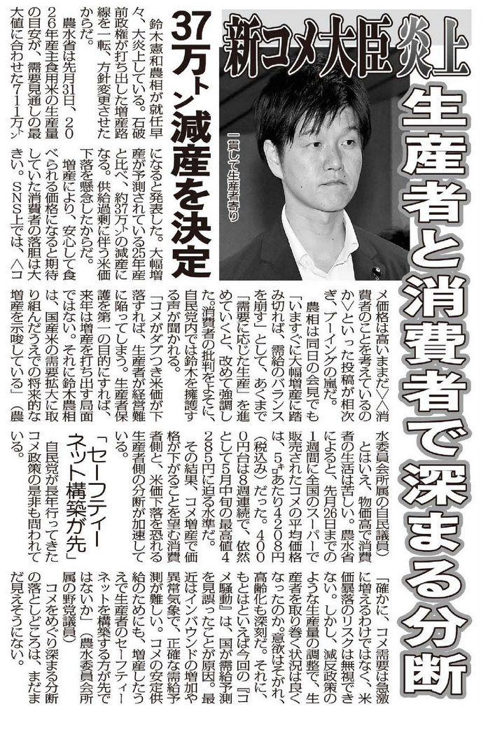 農相は同日の会見でも「いますぐに大幅増産に踏み切れば、需給のバランスを崩す」として、あくまで「需要に応じた生産」を進めていくと、改めて強調した。消費者の批判をよそに、自民党内では鈴木氏を擁護する声が聞かれる。