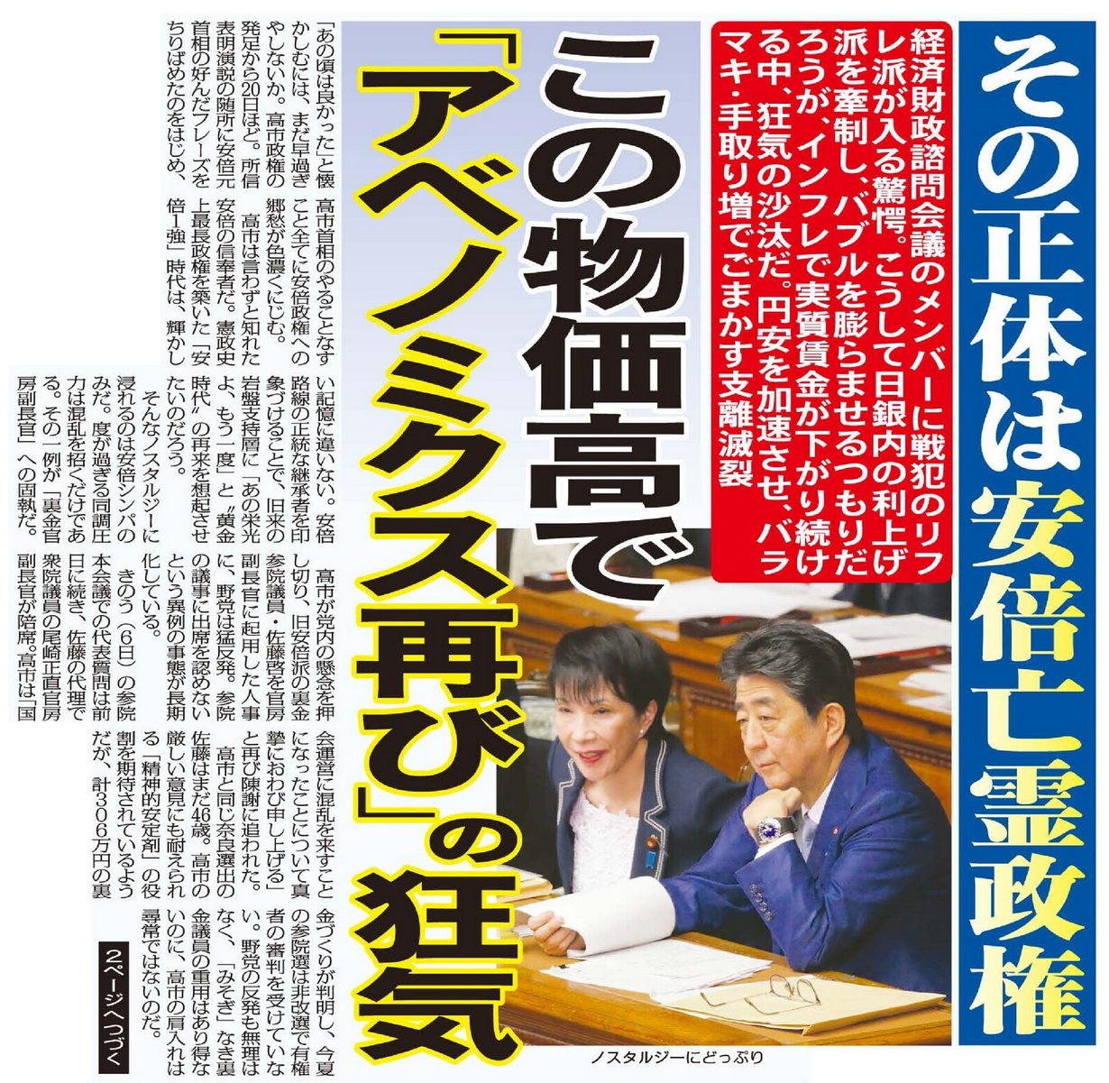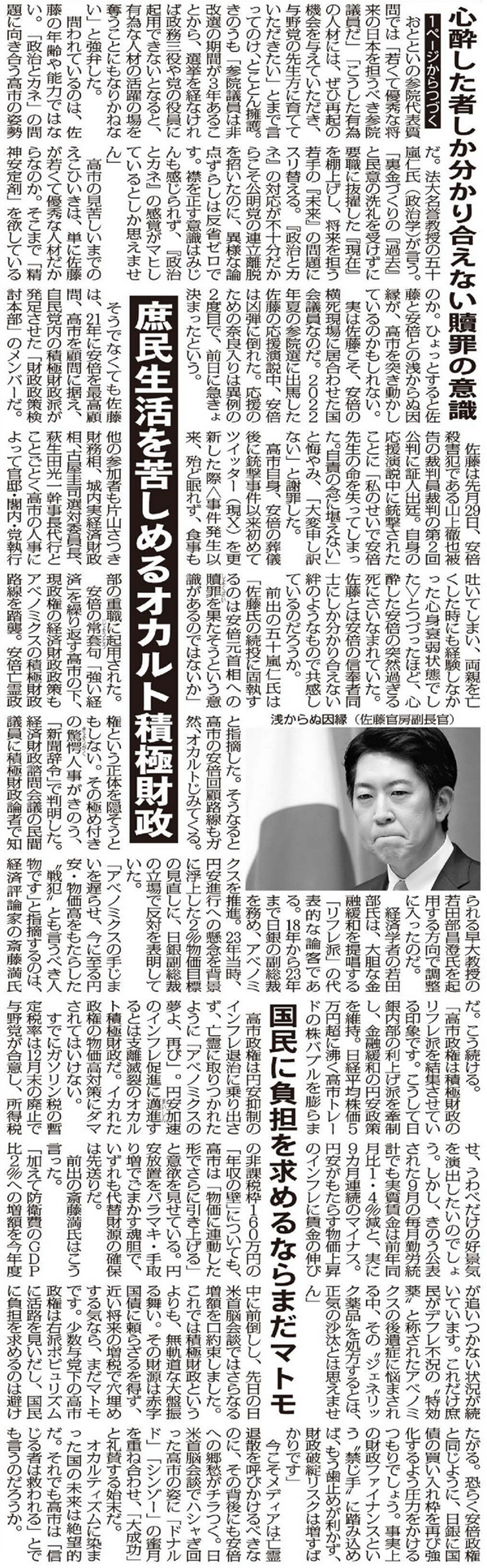 前出の五十嵐仁氏は「佐藤氏の続投に固執するのは安倍元首相への贖罪を果たそうという意識があるのではないか」と指摘した。そうなると高市の安倍回顧路線もガ然、オカルトじみてくる。