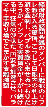 経済財政諮問会議のメンバーに戦犯のリフレ派が入る驚愕。こうして日銀内の利上げ派を牽制し、バブルを膨らませるつもりだろうが、インフレで実質賃金が下がり続ける中、狂気の沙汰だ。円安を加速させ、バラマキ・手取り増でごまかす支離滅裂。