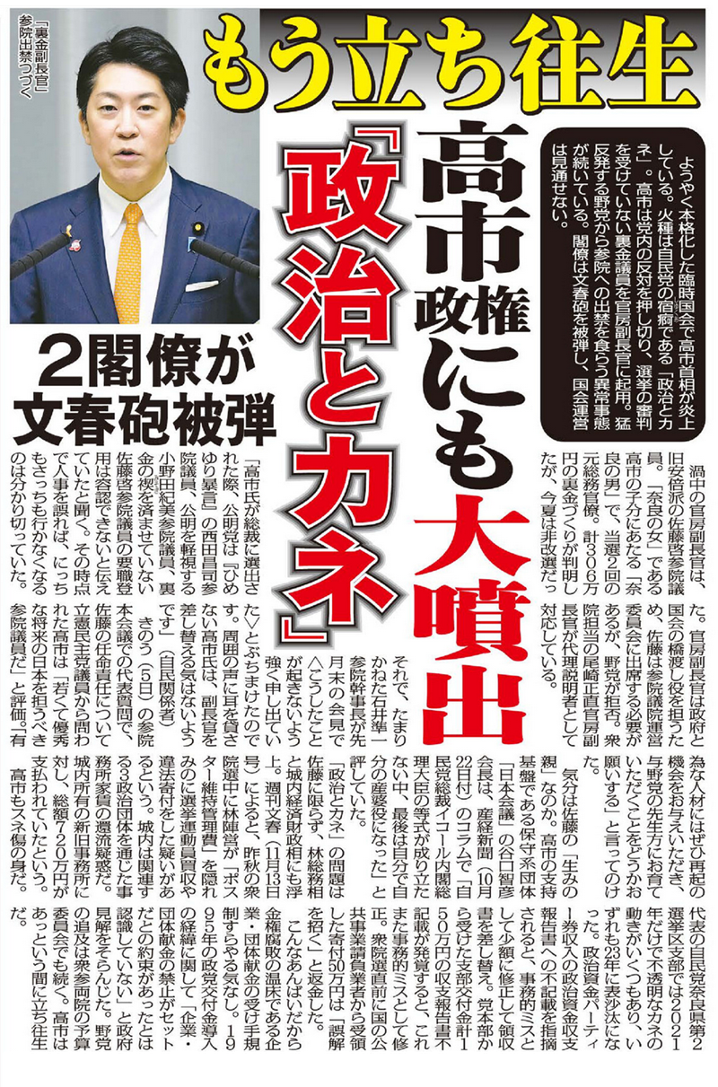 ようやく本格化した臨時国会で高市首相が炎上している。火種は自民党の宿痾である「政治とカネ」。高市首相は党内の反対を押し切り、選挙の審判を受けていない裏金議員を官房副長官に起用。猛反発する野党から参院への出禁を食らう異常事態が続いている。閣僚は文春砲を被弾し、国会運営は見通せない。