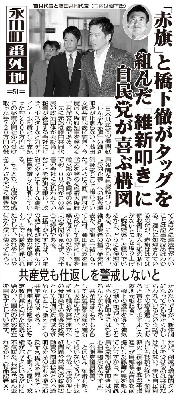 とはいえ、維新も黙ってはいないようだ。仕返しに、今後、赤旗の押し紙問題や共産党の政務活動費や関連企業との不透明なカネの流れを徹底追及する構えを見せている。これまでと違い、政権がバックにいるだけに不気味だ。共産党、踏ん張れるか? (特命記者X)
