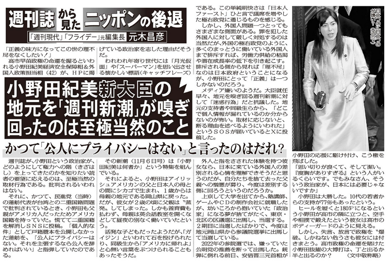小野田紀美経済安保相の地元を週刊新潮が嗅ぎ回ったのは至極当然のこと 週刊誌からみた「ニッポンの後退」