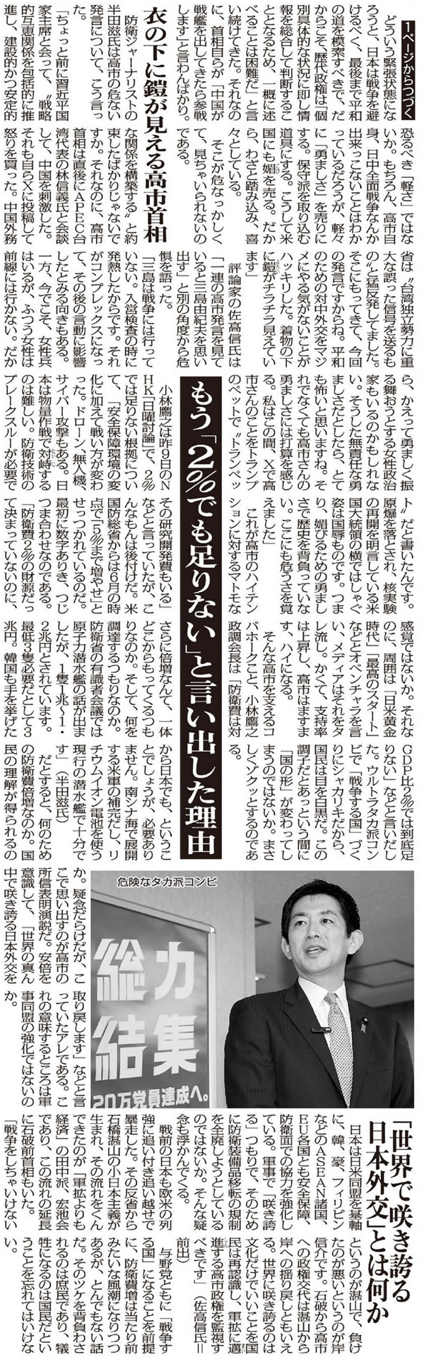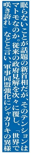 眠らないことが話題の新首相だが、そのテンションはマトモなのか。従来の政府見解を次々に覆し、「世界で咲き誇れ」などと言い、軍事同盟強化にシャカリキの異様。タカ派の政調会長とコンビを組み、軍拡大増税に突き進む危うさを野党は果たして止められるのか。