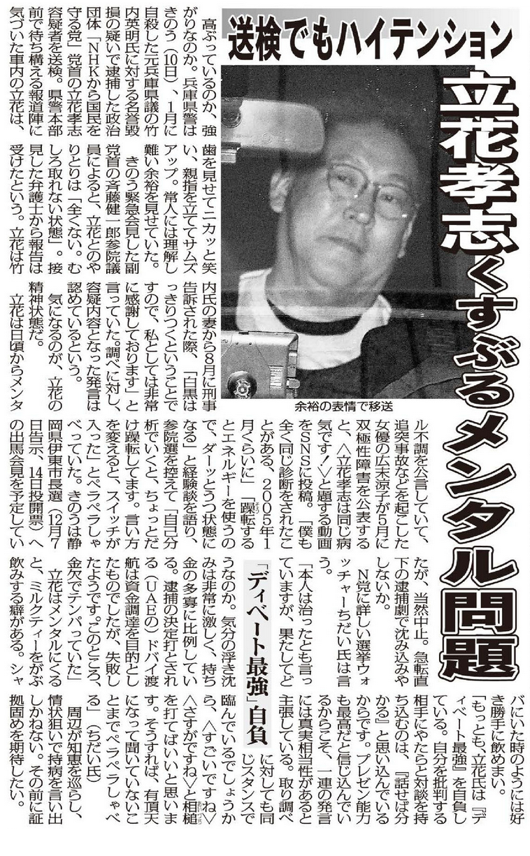 N党・立花孝志容疑者にくすぶる深刻メンタル問題…日頃から不調公言、送検でも異様なハイテンション