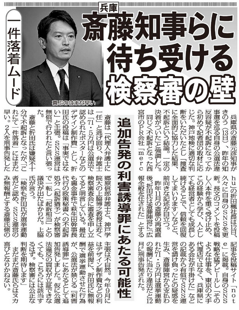 昨年11月の斎藤氏の再選直後、折田氏は斎藤陣営に「広報全般を任された」とする記事を投稿サイト「note」に掲載。自身のSNS戦略を猛アピールし「そのような仕事を、東京の大手代理店ではなく、兵庫県にある会社が手掛けた」などの記載から有償でSNS運営を請け負ったとの疑惑を生み、斎藤陣営から支払われた71.5万円は選挙運動の報酬に当たり違法だと12月に刑事告発された。
