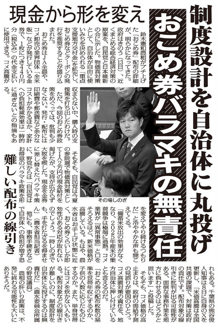 「おこめ券の配布枚数の基準を世帯年収にするのか、子供の人数に応じたものにするのか。また、単身世帯にはコメを炊かない人もいる。配布対象などの線引きが難しいのに、制度設計を自治体に丸投げするのは無責任だ」(農水委員会所属の野党議員)