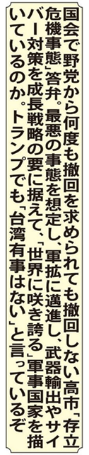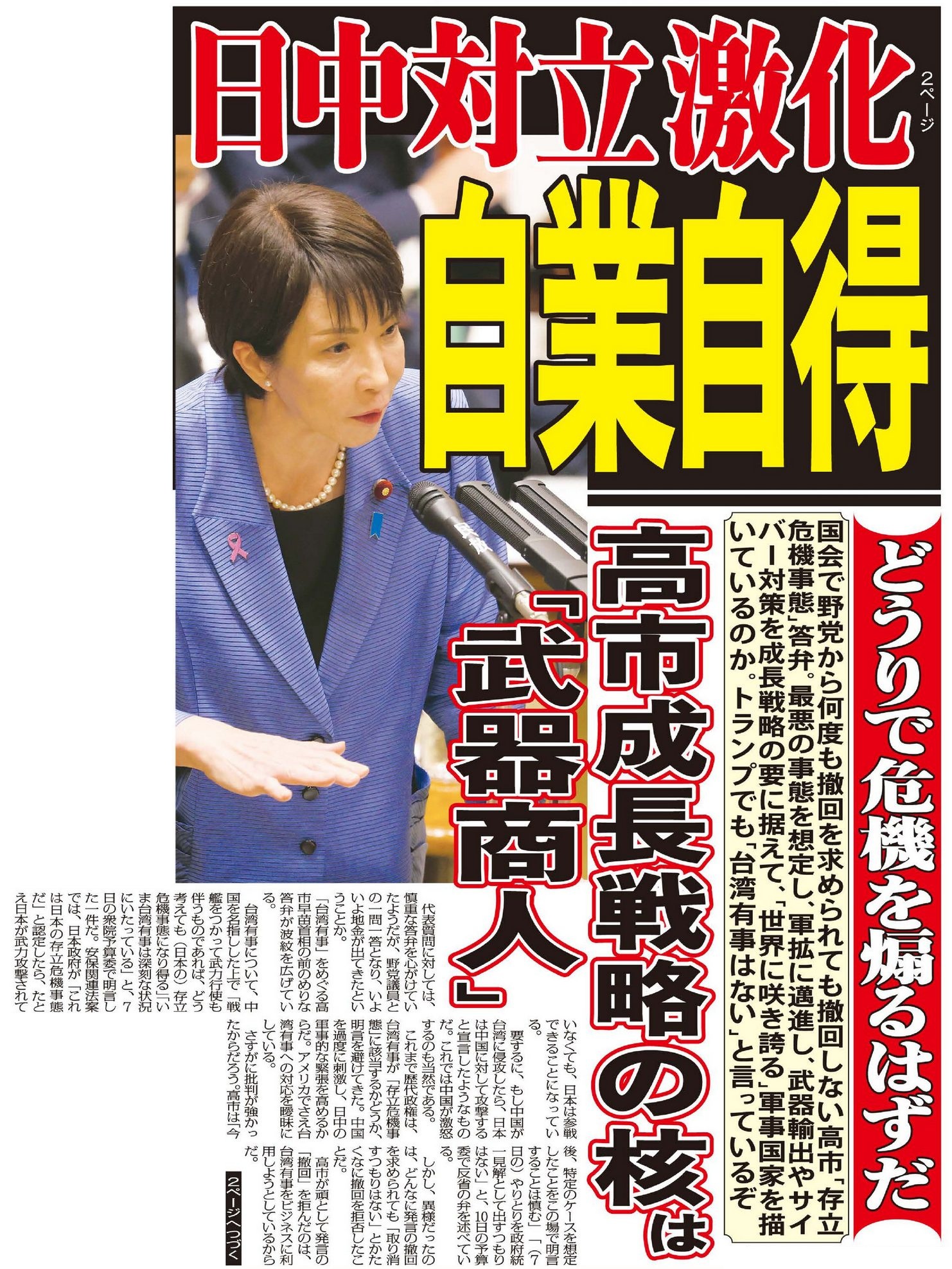 国会で野党から何度も撤回を求められても撤回しない高市「存立危機事態」答弁。最悪の事態を想定し、軍拡に邁進し、武器輸出やサイバー対策を成長戦略の要に据えて、「世界に咲き誇る、軍事国家を描いているのか。トランプでも「台湾有事はない」と言っているぞ。