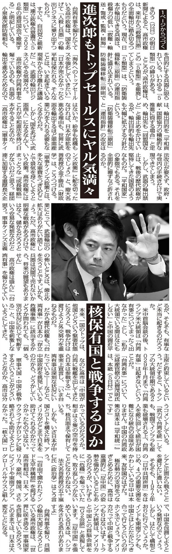台湾有事を煽り、兵器の輸出大国になろうとしている高市政権は、「世界に咲き誇る」軍事国家を目指しているだろう。このままでは、日本は大変なことになる。