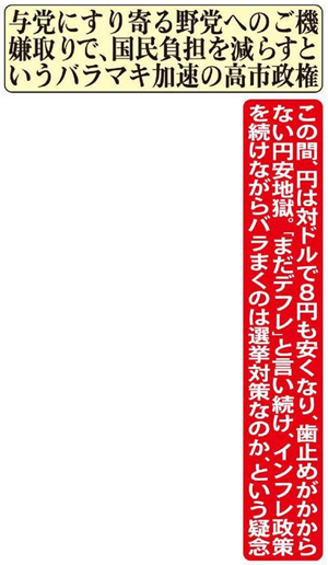 与党にすり寄る野党へのご機嫌取りで、国民負担を減らすというバラマキ加速の高市政権。この間、円は対ドルで8円も安くなり、歯止めがかからない円安地獄。「まだデフレ」と言い続け、インフレ政策を続けながらバラまくのは選挙対策なのか、という疑念。