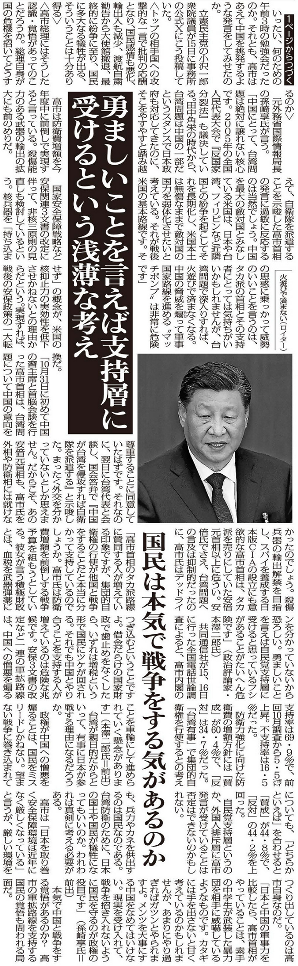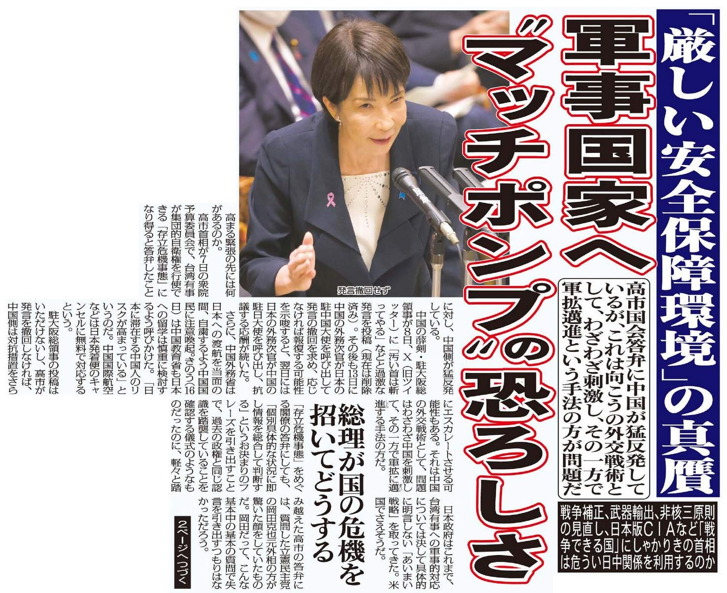 駐大阪総領事の投稿はいただけないし、高市が発言を撤回しなければ、中国側は対抗措置をさらにエスカレートさせる可能性もある。それは中国の外交戦術として、問題はわざわざ中国を刺激して、その一方で軍拡に邁進する手法の方だ。