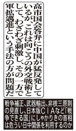 戦争補正、武器輸出、非核三原則の見直し、日本版CIAなど「戦争できる国」にしゃかりきの首相は危うい日中関係を利用するのか。