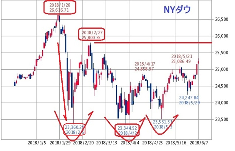長期金利が上昇し、米ドルが下落し、NYダウが下落したのである。